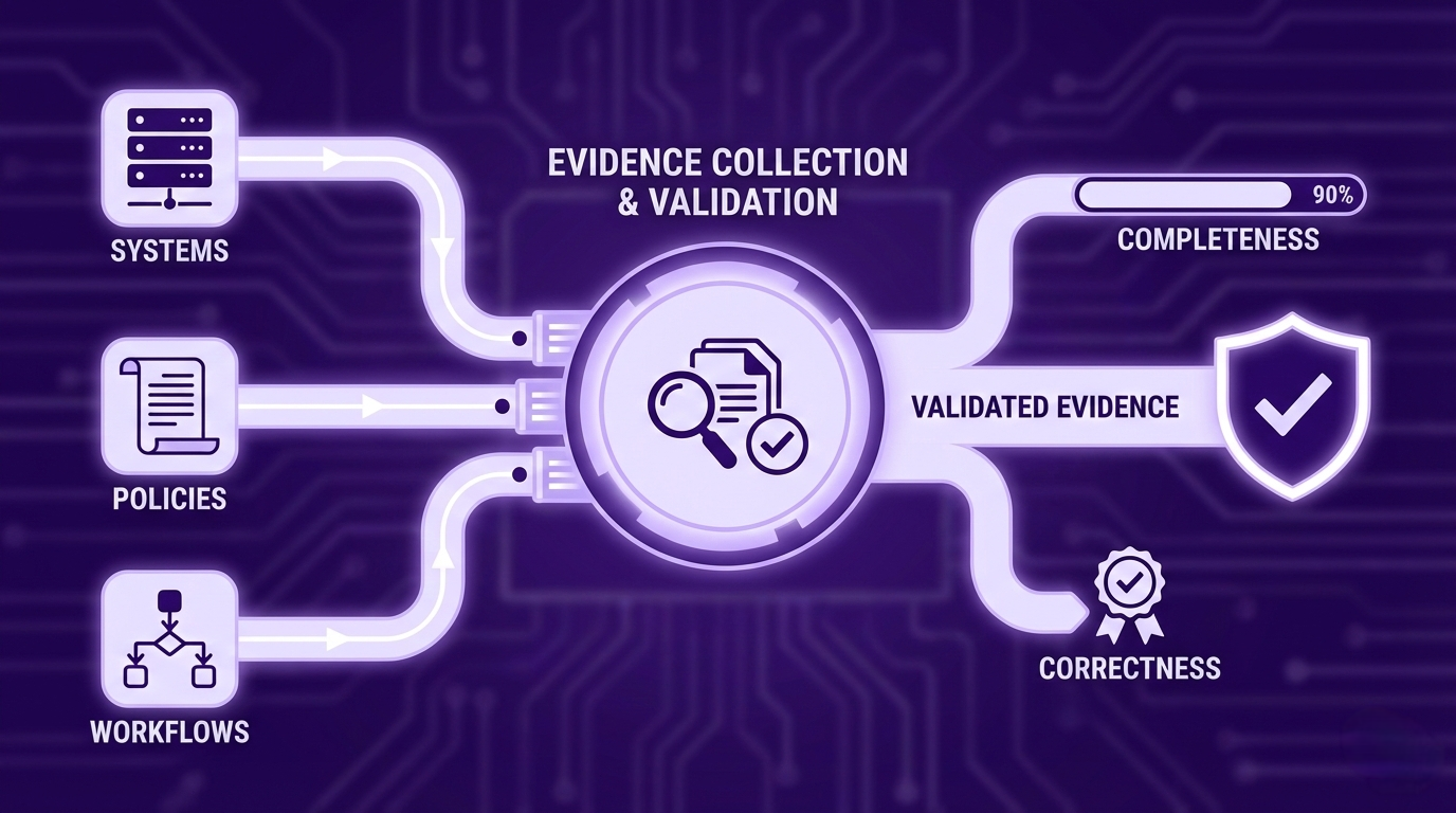 Auto-collect evidence from systems, policies and workflows; validate completeness and correctness.