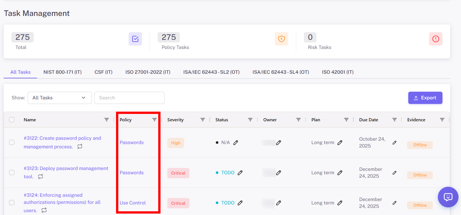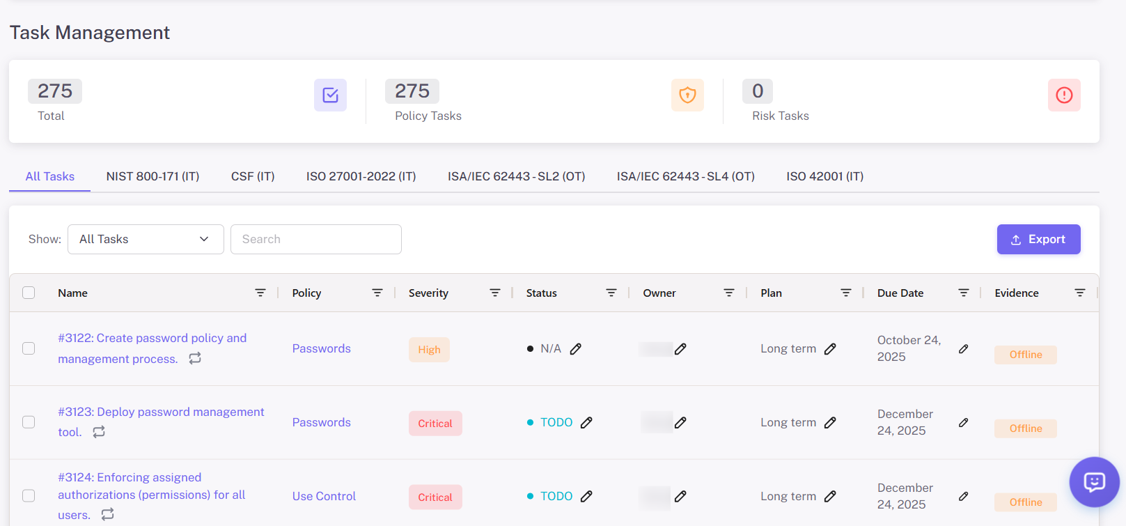 Every task is tied to a control, policy or requirement.