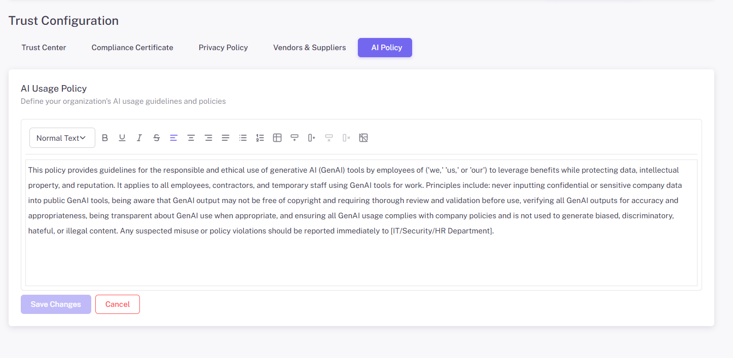 Publish only what you choose: Privacy Policy, AI Usage Policy, Risk Assessment Methods, Employee Training Practices, CI/CD & Continuous Improvement. All content is fully editable with rich text formatting.