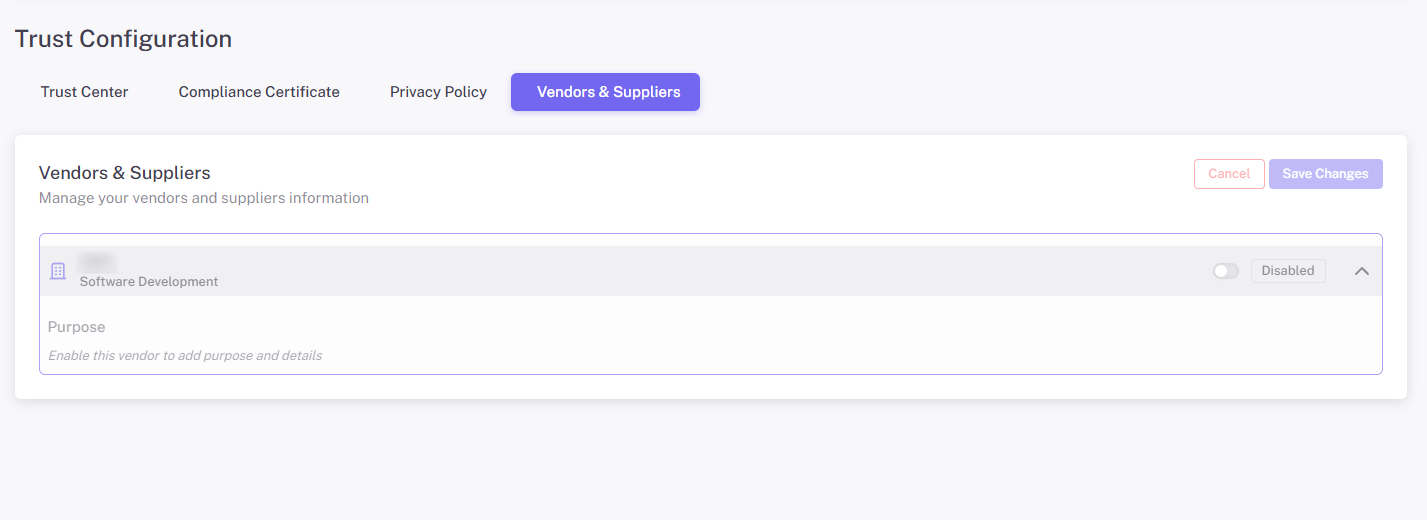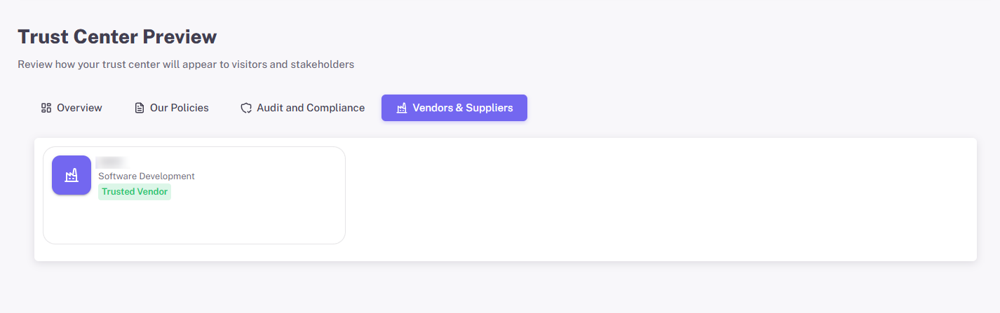 Showcase approved vendors and software providers (e.g., AWS, Azure, GCP) with purpose tags and trust status building credibility in your supply chain.