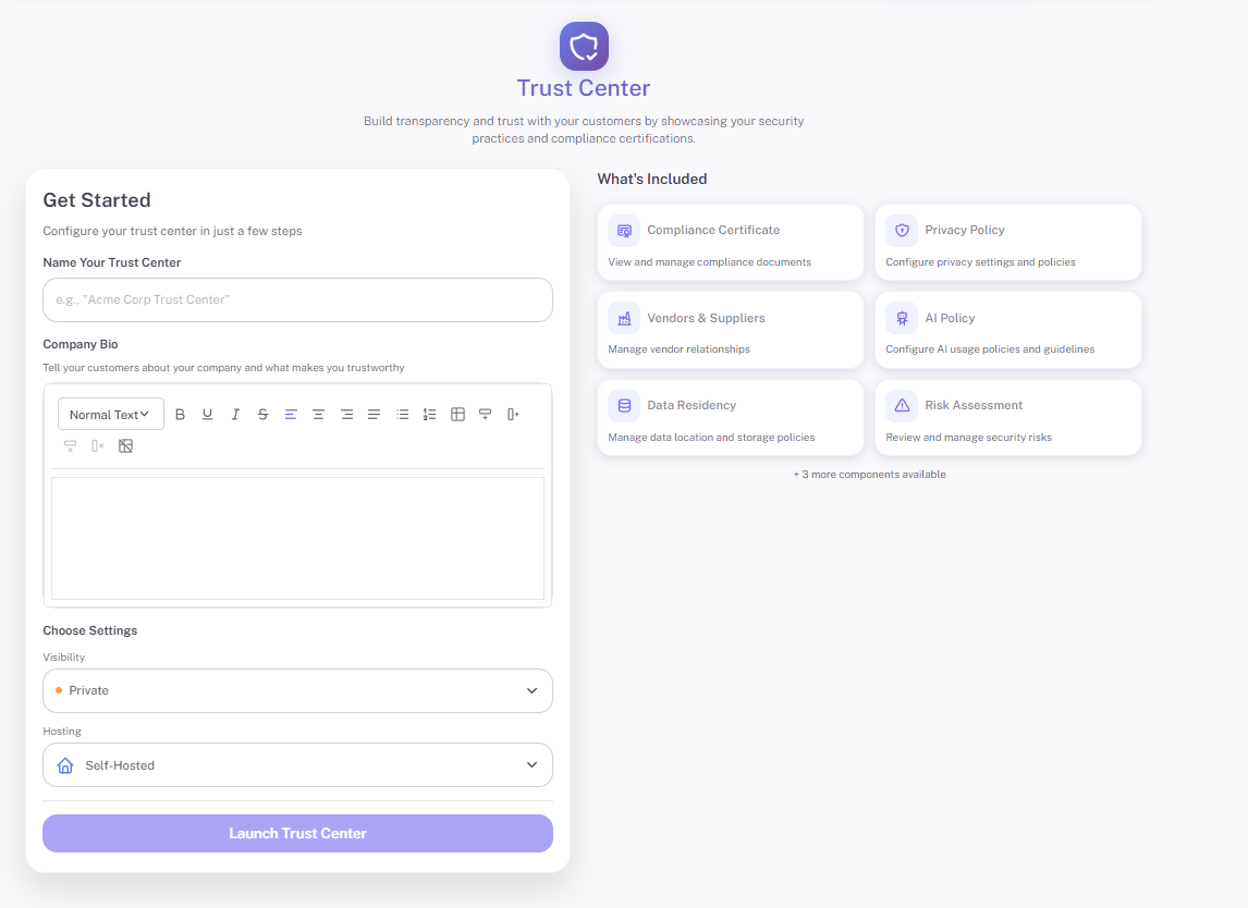 Host the Trust Center publicly with selective masked content or publish strictly for invited stakeholders ideal for regulated industries.